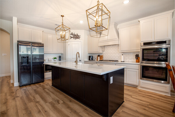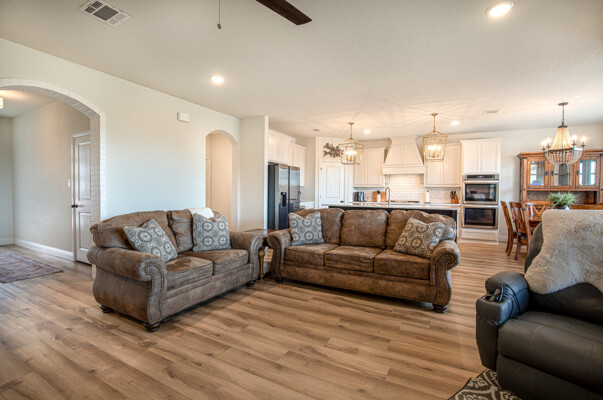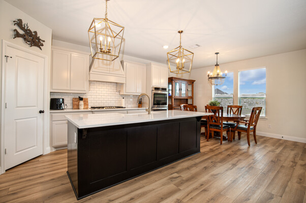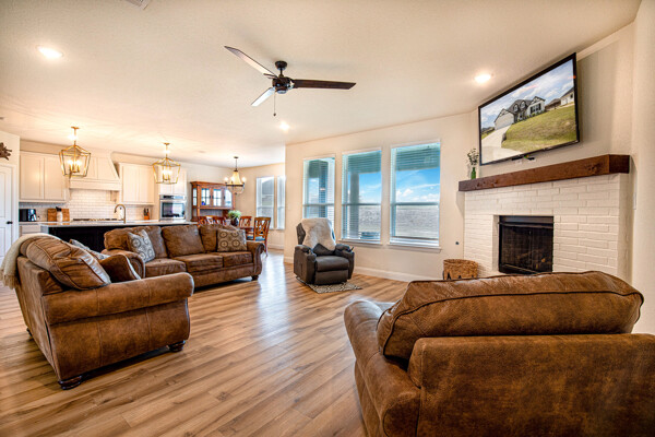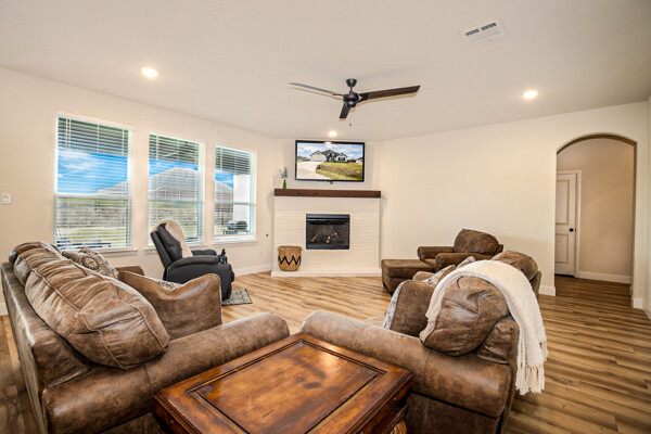 This charming home in the acclaimed Godley ISD offers a blend of style and functionality. An oversized front porch with landscaping and a full sprinkler system welcomes you. Inside, luxury vinyl plank flooring flows through an open concept layout, leading from the spacious living room to a chef’s kitchen with an oversized center island, quartz countertops, a large farmhouse sink, and stainless steel appliances, including a double oven. Gold accent lighting and fixtures add elegance, while solid cabinetry ensures ample storage. Enjoy the cozy gas fireplace and abundant natural light from large windows. The master suite features an ensuite bathroom with dual shower heads and an oversized vanity. Three additional bedrooms with large closets and a hallway bathroom are on the opposite side. Outdoors, a large covered patio and spacious yard provide room for a pool or play area, perfect for families. Community pool and clubhouse. Ask us about zero down and low interest rate options!